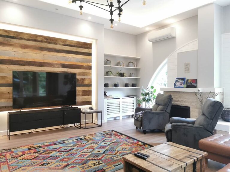 A bútorok kényelmesek és praktikusak; a barna bőrfotel és a kanapé stílusosan egészítik ki egymást, míg az egyedi szőnyeg élénk díszítőelemként funkcionál, fokozva a barátságos légkört. Az alacsony asztal természetes, rusztikus fából készült, amely melegségével és textúrájával otthonossá varázsolja a teret.